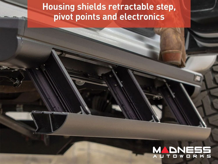 ActionTrac™ retractable running boards operate with a single rotary motor to ensure quiet, reliable, long-lasting, maintenance-free operation. The motor, pivot points and all electrical components are shielded within the main housing, further protecting them from the elements. Each set of running boards comes with a limited lifetime warranty and is assembled right here in the USA for the utmost quality.