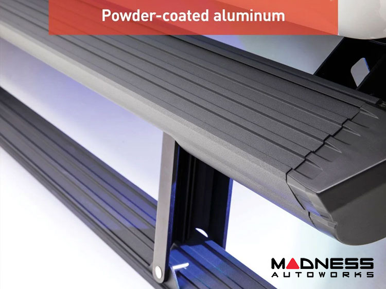 ActionTrac™ powered running boards are engineered for off-roading. They are constructed with extruded 6061-T6 aluminum, making them lightweight, non-corrosive and very durable. They also feature a carbide black powder coat finish to maximize corrosion resistance. This enhanced construction, together with the contoured design of the running boards, provides extra protection for the sides of the vehicle from small rocks and other debris that might scratch or mar the vehicle's finish.