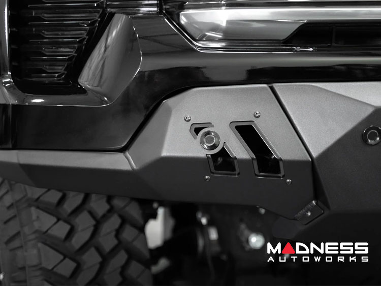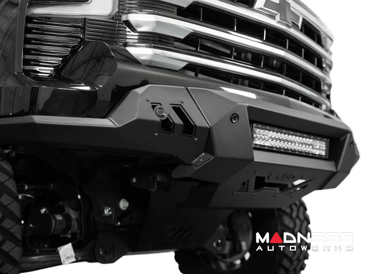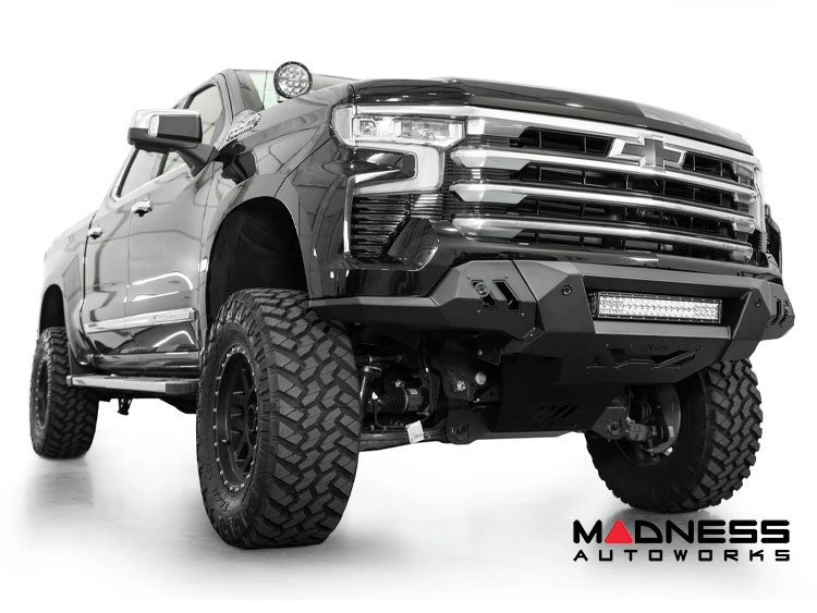 Finished in a hammer black powder coat with satin black accent panels, this front bumper not only adds style to your Silverado but also offers durability to withstand rough elements. The fully bolt-on design makes installation a breeze.