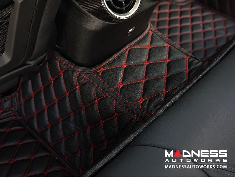 These floor liners are made from environmentally friendly simulated leather material, ensuring not only quality but also sustainability. The black color with red stitching adds a custom touch to your vehicle's interior, making it stand out from the rest.