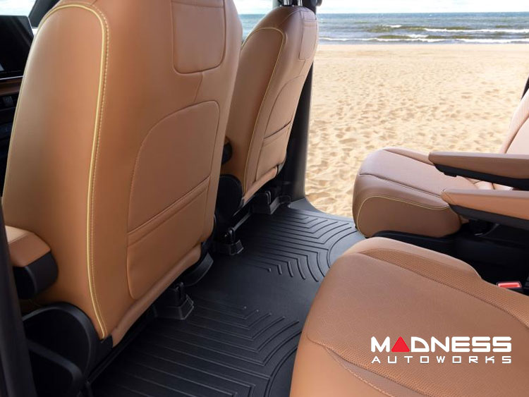 Experience advanced engineering with surfaces that not only resist dirt and debris but actively transport them away from shoes and clothing, giving you peace of mind no matter where the road takes you. The high sides of these liners provide comprehensive protection up to the vehicle’s footwell sides, ensuring full coverage, including the third-row bench seating area, so every passenger space is accounted for.