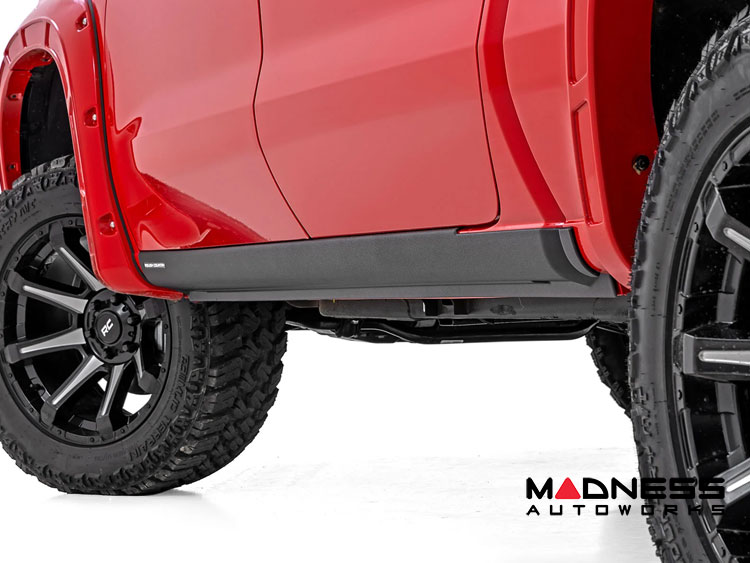 Rough Country's Rocker Sill Plates are a practical yet stylish addition to your Silverado 1500. Often, the rocker area bears the brunt of adverse conditions, resulting in unsightly scratches, chips, and dents. These plates offer an effective solution, covering up rusty pinch welds and other imperfections to ensure your truck remains the centerpiece of attention on and off the road. Their robust construction and sleek design complement the Silverado's inherent strength and aesthetic appeal.