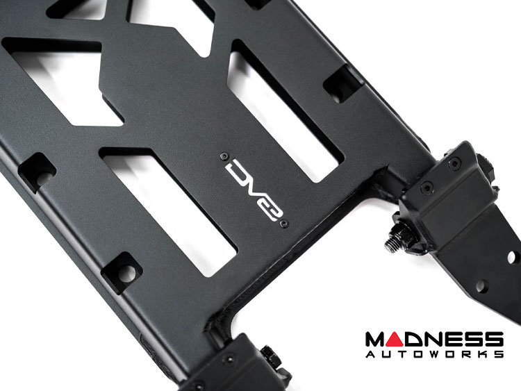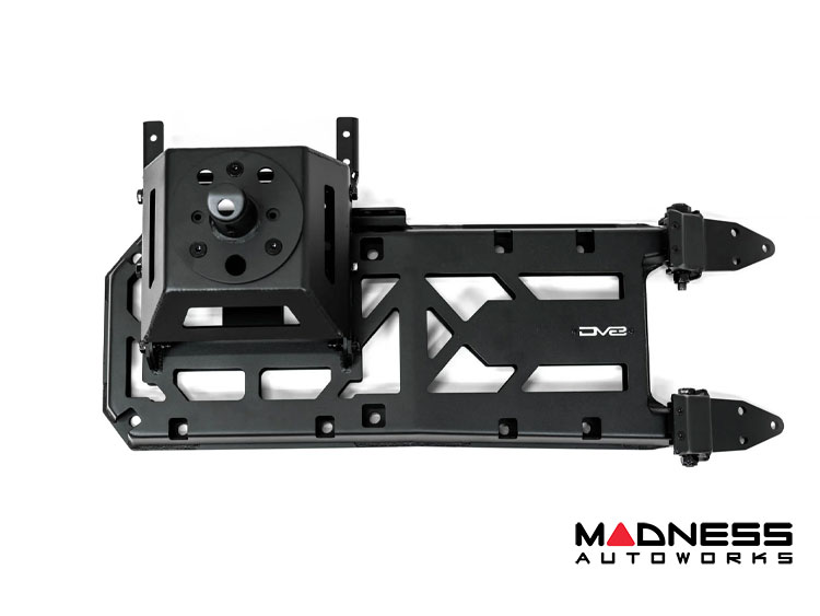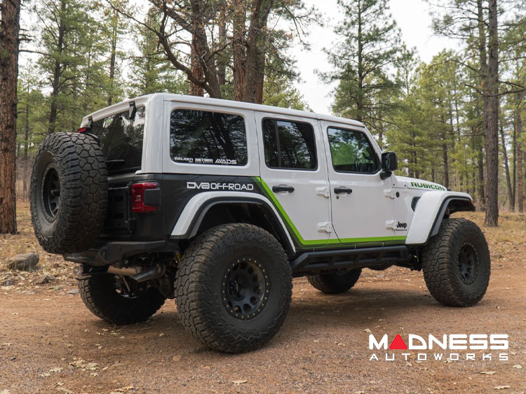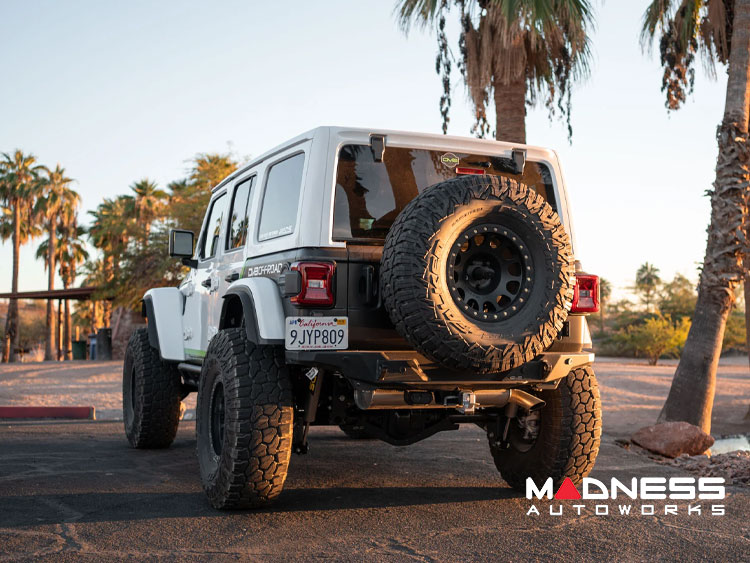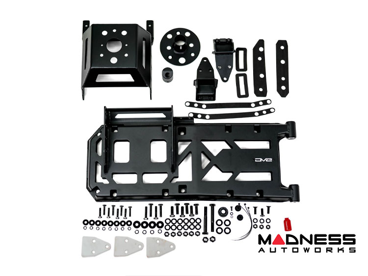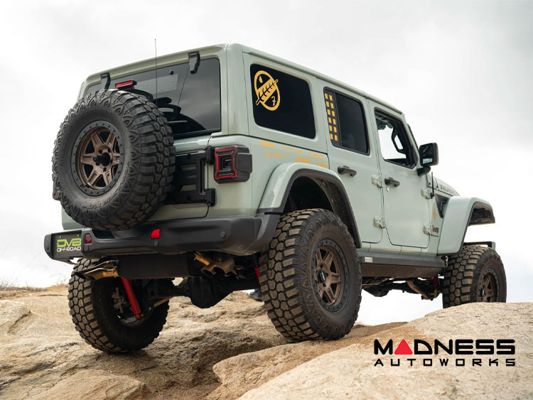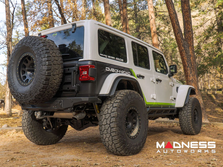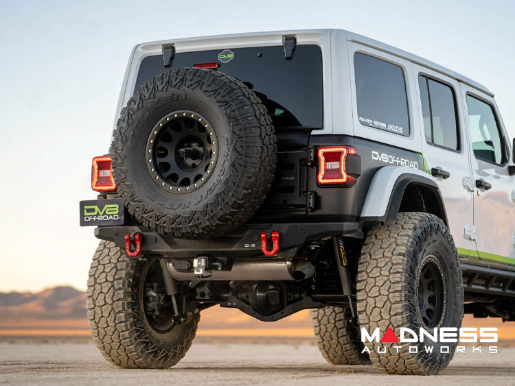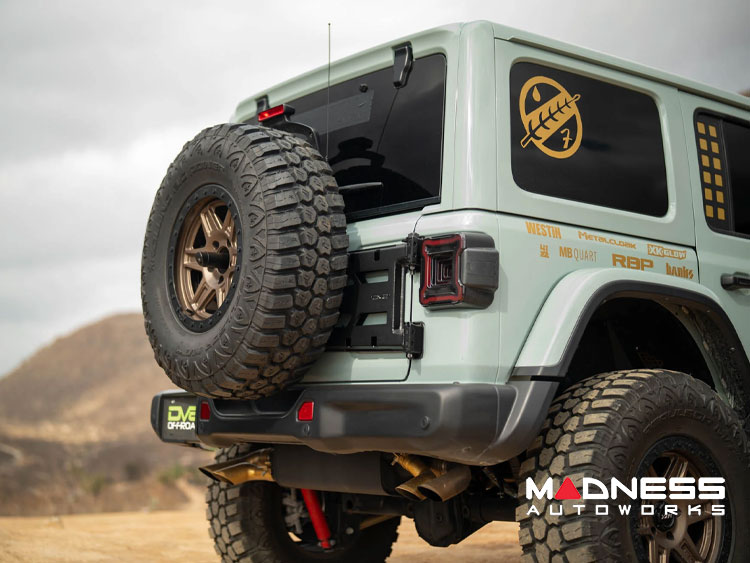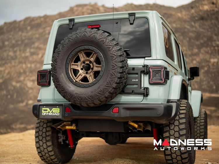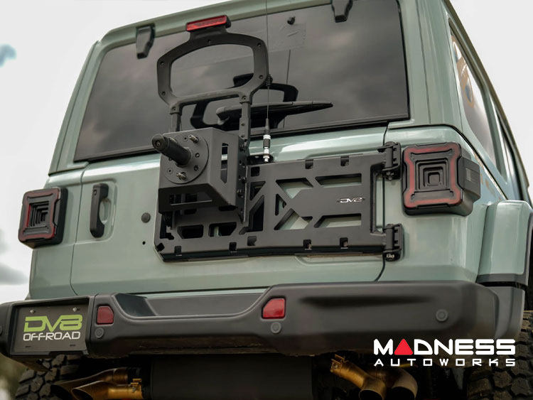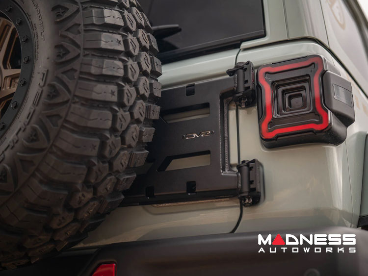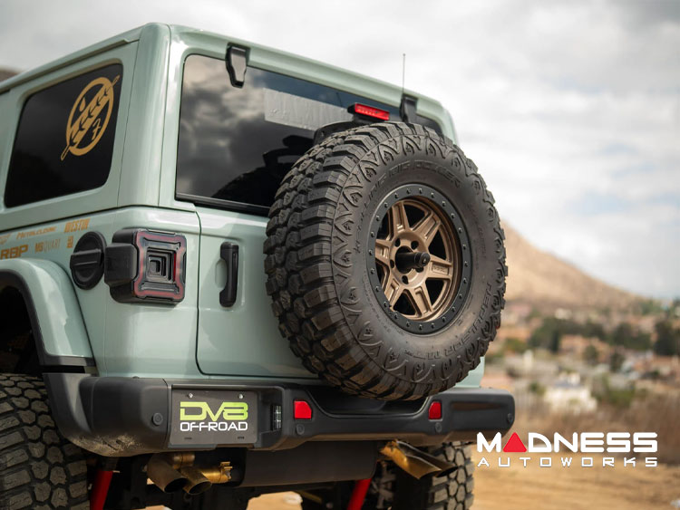 This tire carrier is capable of fitting up to a 20-inch wheel and a 38” x 13.5” tire. We recommend its use with wheels that have a 4-inch backspacing. Please note, it is incompatible with -44 offset wheels and wheels wider than 9.5 inches. Factory wheels with 2" or larger wheel spacers can be used. Do keep in mind that Xtreme Recon and Rubicon X models require the DV8’s Camera Extension Bracket for rear camera retention, and it is not suitable for models equipped with the Mopar On-Board Air Compressor option.