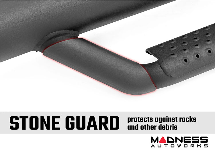 These Nerf Steps are not just about making entry and exit convenient; they offer exceptional durability and added protection to your Jeep. Made from .084 wall, corrosion-resistant tubing, these side steps are built to endure the harshest conditions, ensuring long-lasting use and reliability. The design features a sleek, streamlined look that complements the rugged nature of your Jeep without adding bulk. The integrated stone guards provide an added layer of defense against kicked-up rocks and debris, safeguarding your vehicle’s paintwork from potential damage. Beyond just aesthetics, these side steps offer robust undercarriage protection against road debris, rocks, and obstacles, effectively serving as a protective shield for your vehicle's underside.