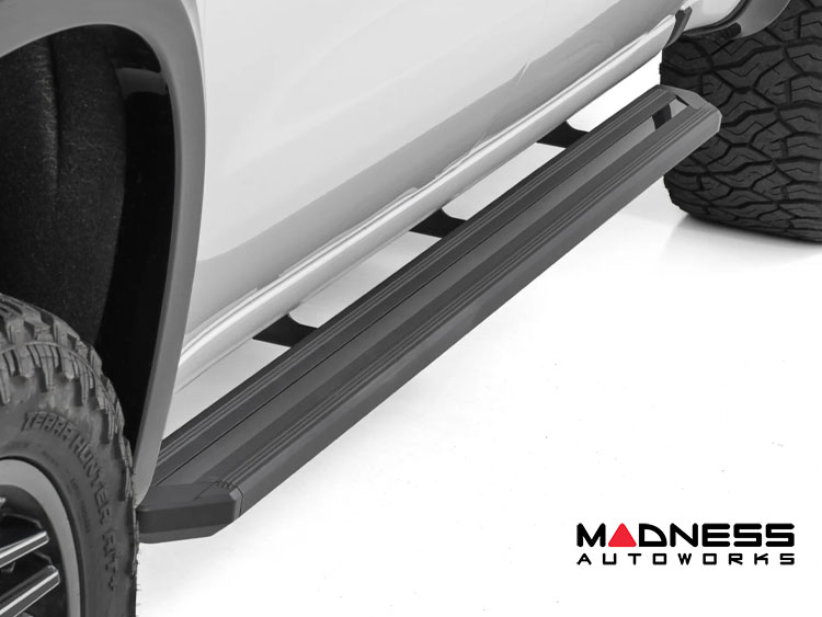 With the Chevrolet Silverado Side Steps, you'll enjoy effortless access to your vehicle, thanks to their user-friendly design. Engineered for a hassle-free bolt-on installation, these side steps require no drilling, ensuring a quick and straightforward setup. The sleek cab-length design not only provides full coverage but also shields your vehicle from road debris and rock chips, thanks to the protective black powder coat finish. Built from durable one-piece aluminum, these running boards are lightweight, strong, and resistant to corrosion, ensuring long-lasting performance. The added benefit of integrated LED strips illuminates your path, providing enhanced visibility and a touch of style. The Bluetooth-controlled LED lighting system allows you to customize the step lighting, adjusting the on-time from 1 second to 10 minutes for added convenience.