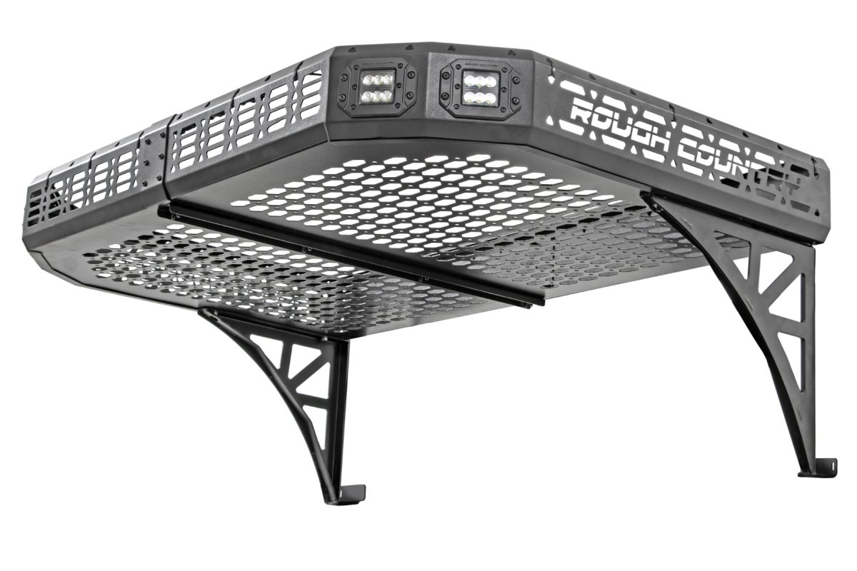 Introducing the CFMOTO UFORCE 1000 Cargo Rack - Rear - Rough Country - Dual 2" LED Pairs | Flush Mount - Black. Designed specifically for the CFMOTO UFORCE 1000 and UFORCE 1000 XL, this cargo rack is the perfect addition for those who need to expand their adventure-ready storage without compromising on the functionality of their dump bed.