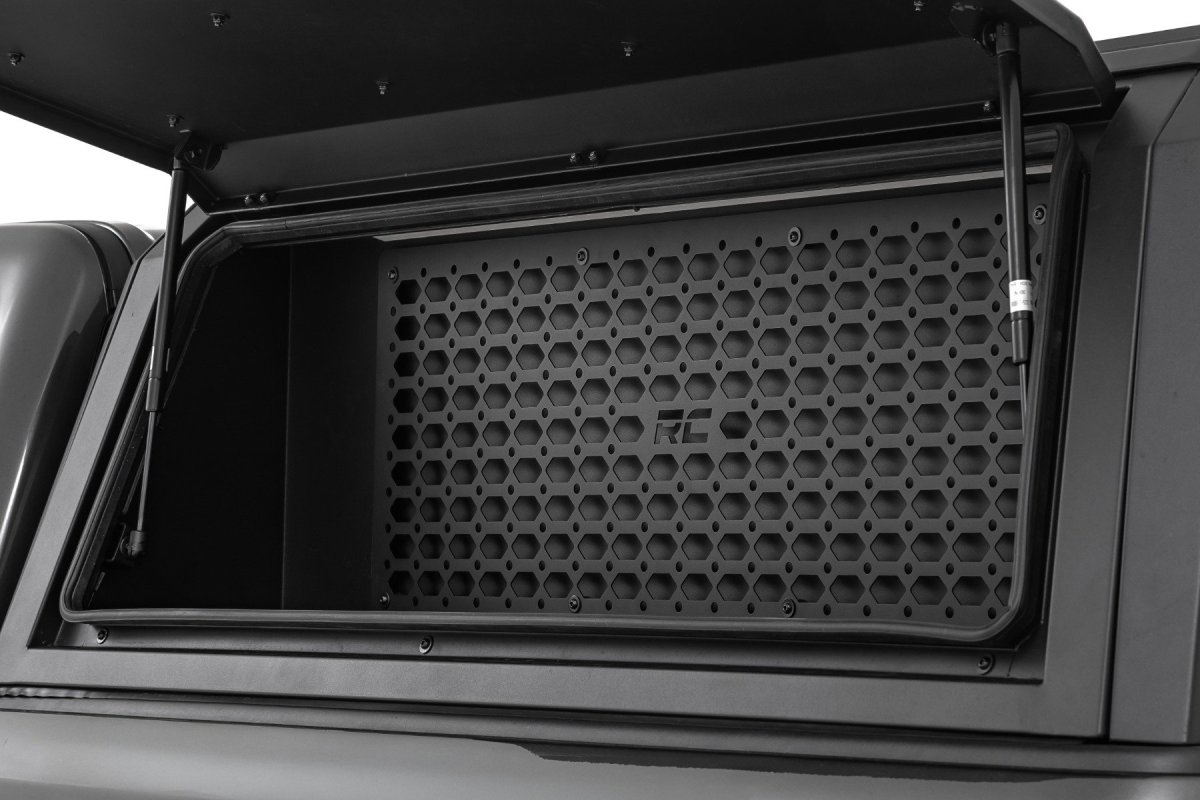 The Bed Cap Molle Panel Side Storage Bin - Driver's Side - Rough Country is a top-tier storage solution that enhances your truck's organization and utility. Specifically designed to complement the Rough Country Bed Cap, this rugged and reliable storage bin ensures your gear is safely stowed yet easily accessible during any adventure.