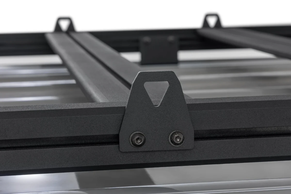 This roof rack is crafted from powder-coated aluminum, ensuring both lightweight strength and resistance to corrosion over time. Its all-weather finish is designed to withstand harsh weather, UV rays, and the rugged conditions of the trail, making it an ideal companion for all your journeys. The roof rack is equipped with adjustable cross bars and a slotted T-rail system, offering limitless mounting options. Whether you're attaching lights, awnings, jacks, recovery gear, or storage solutions, this roof rack is your versatile partner. The cross bars can be flipped or slid to create a basket-style layout or arranged to secure specific gear, making it highly adaptable to whatever equipment you need to transport. With an impressive load capacity, it can handle a 600 lbs static load and 300 lbs dynamic load, perfect for supporting rooftop tents, cargo, and overlanding setups.