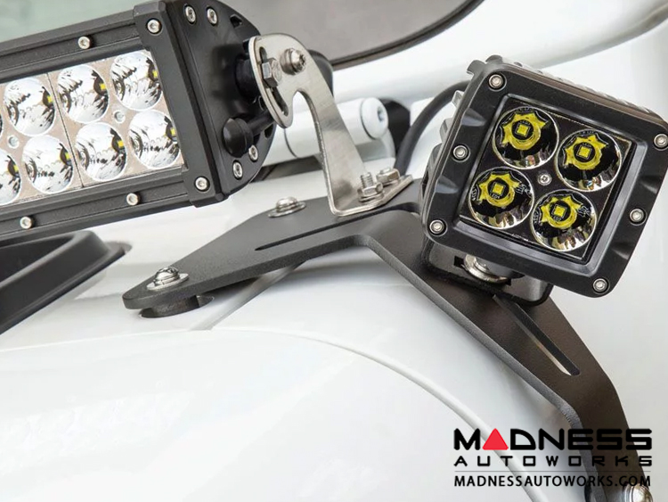 ARIES Jeep windshield light brackets allow you to mount an LED light bar on your Jeep Wrangler or Jeep Gladiator, using the windshield hinges. They require no drilling and provide useful light for the road or trail ahead. This set of brackets comes with the ARIES 50" double-row LED light bar and waterproof wiring harnesses for a complete installation. The brackets feature high-strength carbon steel construction and come with a durable black powder coat finish for lasting protection against the off-road elements.