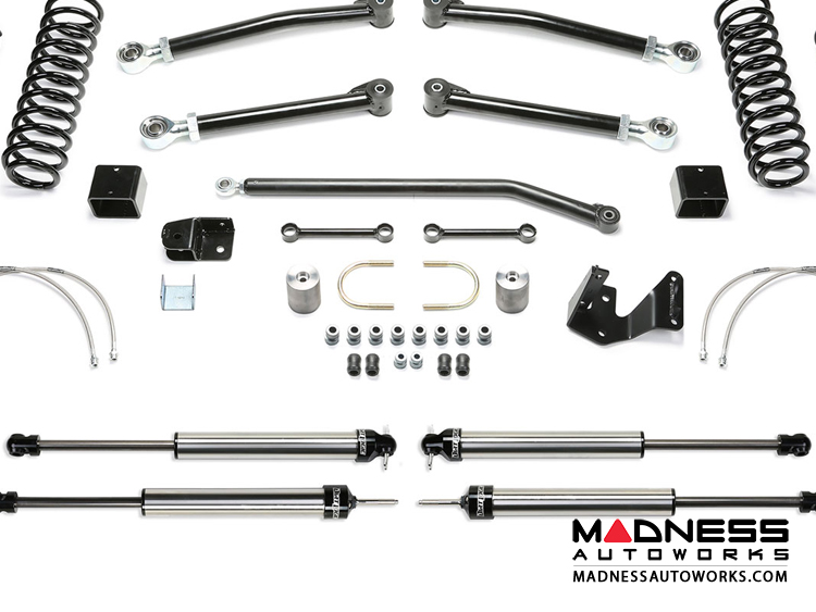 This Short Arm Trail II system replaces all four lower link arms because of their vulnerability to obstacles out on the trail. The heavy duty Link Arms maintain factory parallel joint angles in effort to reduce bushing wear. Constructed of .250” thick wall tubing and 5 Ton Joints, this system is guaranteed to hold up to the abuse. The front and rear track bar brackets weld on and re-centers the axles to accommodate for the increased ride height. This system includes Fabtech’s standard coil springs for balanced performance.