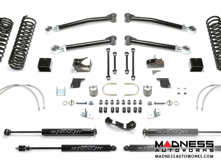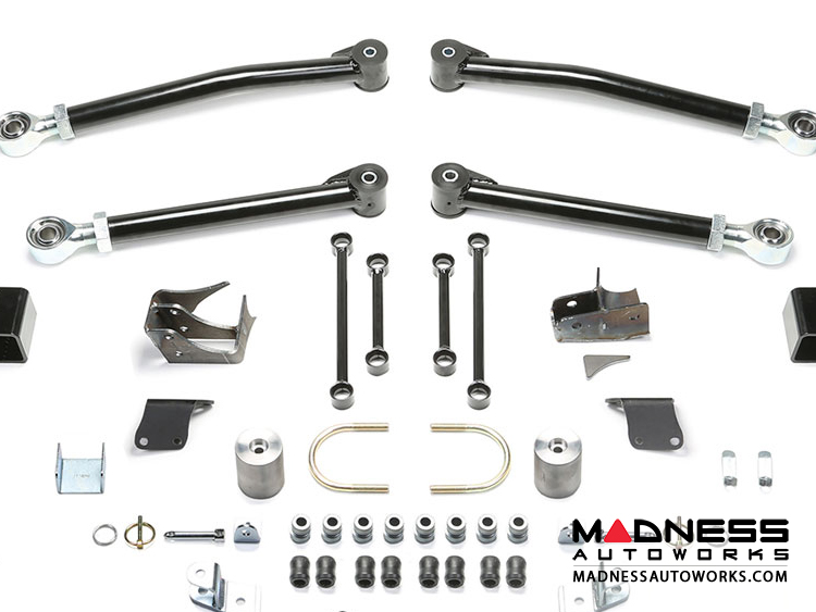 This Short Arm Trail system replaces all four lower link arms because of their vulnerability to obstacles out on the trail. The heavy duty Link Arms maintain factory parallel joint angles in effort to reduce bushing wear. Constructed of .250” thick wall tubing and 5 Ton Joints, this system is guaranteed to hold up to the abuse. The front and rear track bar brackets weld on and re-centers the axles to accommodate for the increased ride height. This system includes Fabtech’s standard coil springs for balanced performance.
