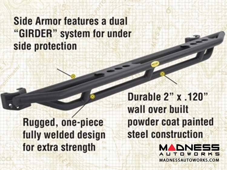 The ultimate vehicle protection! Constructed of heavy duty 2 powder coated steel tube, these tough Side Armor/Rocker Guard units are built to take on the roughest terrain! With two hot styles to choose from, you can customize your Jeep to fit your needs!