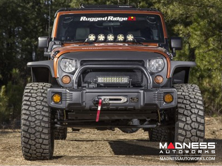 This replacement bumper is lighter than most aftermarket alternatives, but is built to withstand the abuse from harsh elements and obstacles. The Spartacus™ Stubby Front Bumper from Rugged Ridge® features the same unmistakable styling as the original Spartacus, but with a narrow, trail-conquering profile. Tough satin black powder-coated finish on a sturdy 11 gauge stamped steel construction makes this a bumper built to last. The stamping process allows for the most advanced styling on the market, creating a bumper lighter than most aftermarket steel bumpers and is designed to work with all popular winch models (using winch plate 11541.13 sold separately). Uses factory tow hooks.