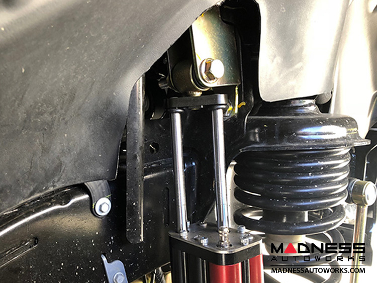 A beautifully built, CNC formed, 7GA steel bracket that allows you to easily mount up to a 15" travel 6Pak shock without the addition of a bulky aftermarket/cut/weld style shock tower. Bolt it on and GO!