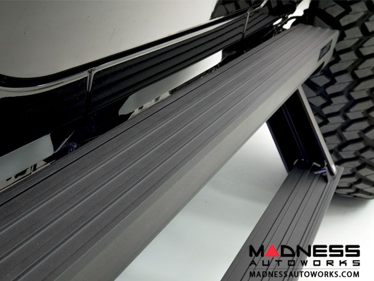 Provide safe and convenient access to your rig, while adding a uniquely contoured look. The boards feature an innovative Step-Within-a-Step™ design that offers safer and easier entry and exit from your rig. As soon as you open the door, the smart sensors automatically deploy the power step, offering a wide and non-skid textured black powder coated surface. When the door closes again, the power step retracts to be safely concealed within the housing.