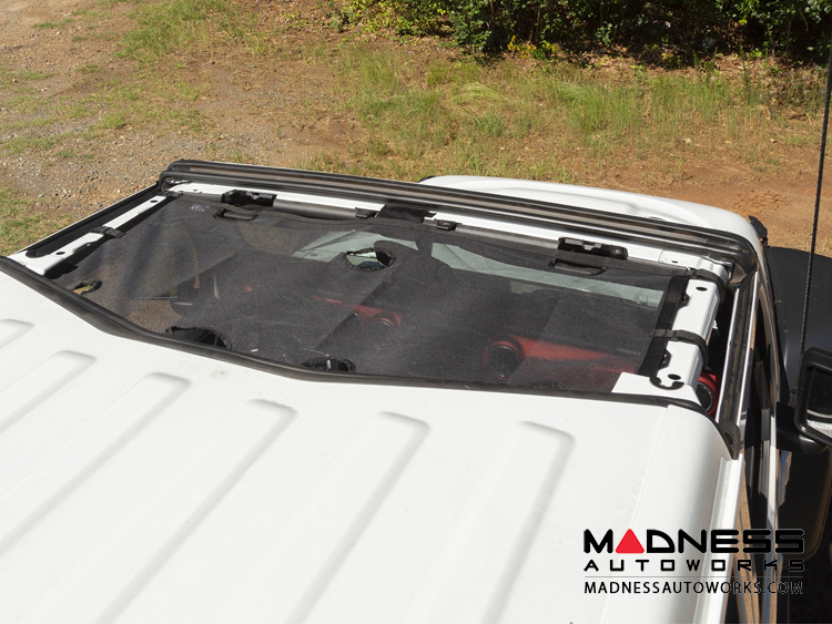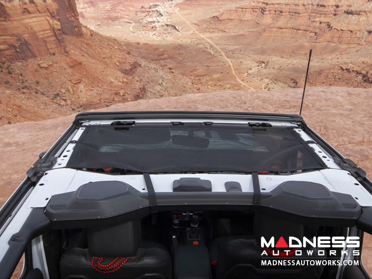 The Rugged Ridge Eclipse Sunshade gives the open air feeling you want, while providing added protection from harsh sunlight. Featuring reinforced mesh construction, the Eclipse Hard Top Sun Shade installs directly to the JL sports bar, helping protect front seat passengers from the sun’s harmful rays when the roof panels are removed. Unique mesh construction also serves to greatly reduce wind noise and buffeting, making a more enjoyable open-top driving experience. Integrated straps with hook & loop backing are easy to install and there’s no need to remove the shade to gain access to roof latches. The Eclipse Sun Shade can stay in place year round- making you fully prepared for that first sunny day. Retains factory use of freedom panels.