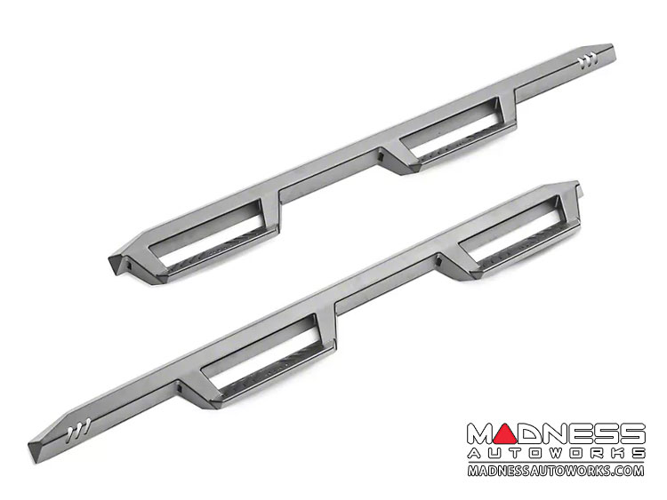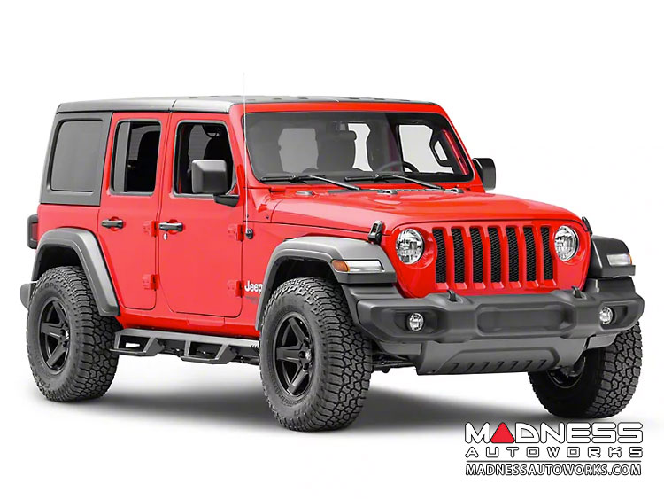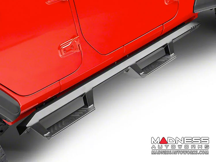 These side steps are a great way to help aid you in getting in your Jeep while also giving you a nice look too. They have a drop down step that has plenty of space for you feet and the all steel construction fit nice and tight to the body of your JL giving you a clean sleek look.