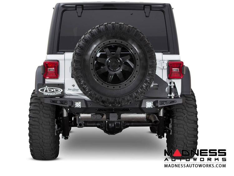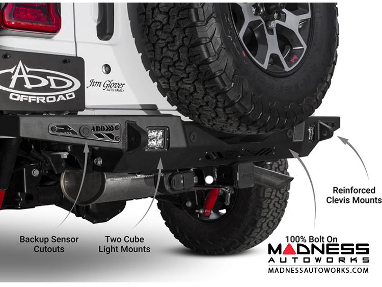 This low profile plate steel bumper that offers superior rear end protection with a sleek appearance for the Jeep Wrangler JL. OEM amenities such as, backup sensors, trailer hitch, and trailer plug bracket are retained with this fully bolt-on Jeep bumper. Two rear facing cube light mounts give the opportunity for additional rear lighting and reinforced clevis mounts offer mounting locations for 3/4" D-Rings for tough situations. The Stealth Fighter bumper can be used with the OEM spare tire carrier or combined with our Stealth Fighter aftermarket tire gate.