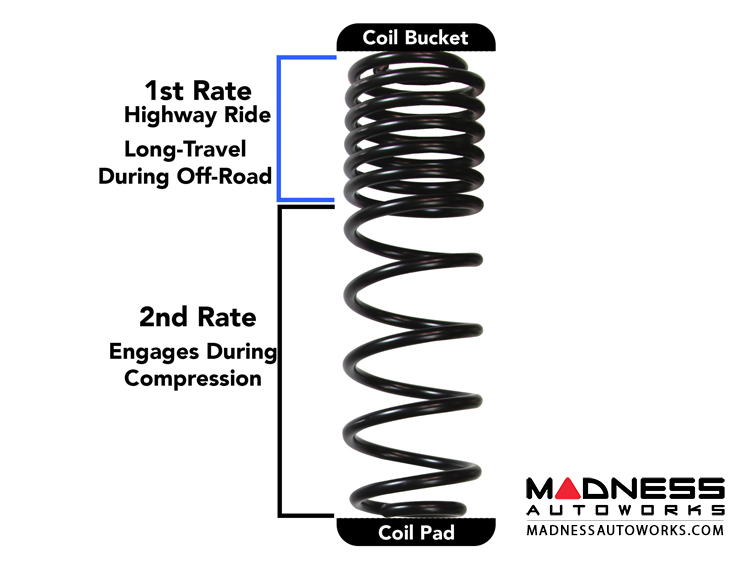 The DUAL RATE-LONG TRAVEL coil springs offer the best of both driving worlds! What this means is the 1st spring rate offers an exceptional highway ride AND the coils will expand while off-roading during extreme articulation as the suspension droops to keep the tires in contact with the ground much longer than a linear rate, or single rate, coil spring resulting in a smoother & more controlled ride while keeping the coil in the coil bucket at full droop. The 2nd rate (lower coils) only engage after compression past the 1st rate. This second rate allows consistent control and stability when heavy off-road suspension movement is required.