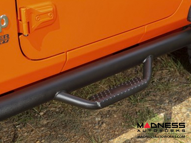 Spartan Nerf Bars feature a 3-inch OD primary tube that fits in a higher position than conventional tube steps offering a cleaner look, while patented drop-down step hoops at each door gives you firm footing for easy entry & exit. Constructed from .084 wall steel tubing and finished with a durable 3-stage textured powder coat, Rugged Ridge Spartan Nerf Bars are designed with the strength and enduring good looks that your Jeep demands. Includes all necessary hardware and installation instructions.