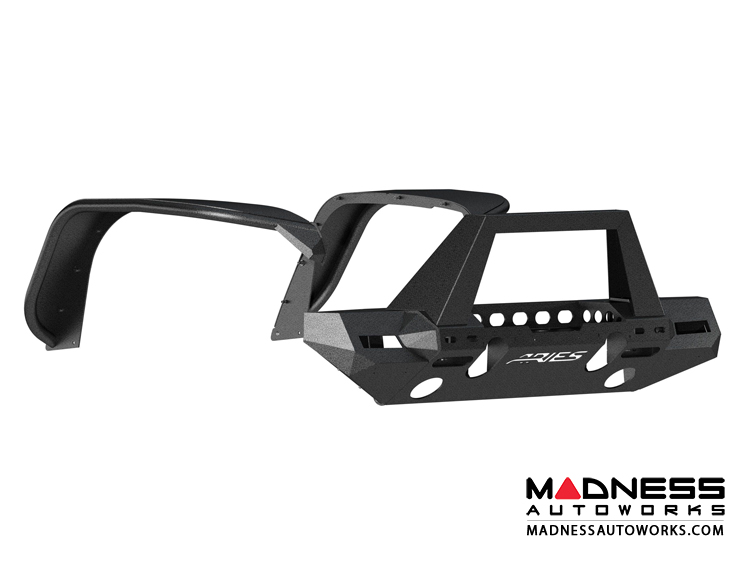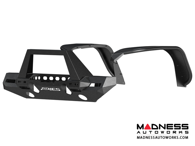 This particular bumper and fender flare kit includes the bumper center section, corner end caps, angular center brush guard and front fender flares. The bumper corners feature unique cutouts to integrate the Jeep JL fender flare turn signals when installing the ARIES fender flares. The Jeep fender flares feature a flat profile that is specifically designed to show off larger, offroad tires. They are constructed from lightweight, rust-free aluminum and feature a unique textured black powder coat finish to maximize corrosion resistance and help hide minor scratches and grime.