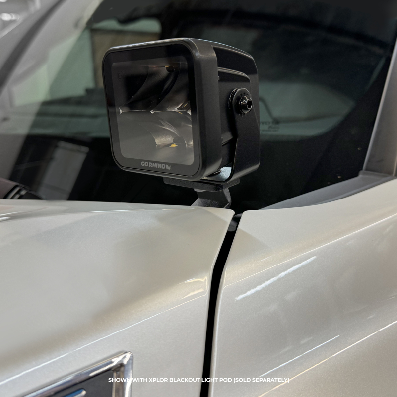 Mounts LED cube lights to truck's hood hinges when extra light is needed. Includes two mounts - one each for driver's and passenger's side. Each set of light mounts are application-specific and constructed for easy, no-drill installation on your truck or SUV. (LED lights sold separately).. Hood Light Mount for 3" X 3" industry standard dual cubes LED, driver and passenger brackets. Light Mounts come with a Limited Lifetime warranty on materials and construction and a 5 year warranty on the Textured Black Finish.. Limited Lifetime warranty on materials and construction and a 5 year warranty on the Textured Black Finish. Convert each single mount into a dual mount using the XE Dogbone Bracket Kit #732400T (sold separately). No-drill installation into factory mount points makes adding lights quick and easy. Go Rhino 22-23 Toyota Sequoia / 23-24 Toyota Tundra XE Hood Hinge Cube Light Mount. XE Hood Hinge Cube Light Mounts - 22-25 Toyota Tundra/23-24 Toyota Sequoia. Compatible with all Go Rhino XPLOR 2x2, 3x3 and Sixline Light Pods. XE Hood Hinge Cube Light Mounts - Fits 2x2 or 3x3 LED Light Cubes. Pair of light brackets: one each for drivers and passengers side. For use with LED cube lights or other small light pods. Light mounts only (LED lights sold separately). Easy installation with no cutting or drilling. Durable mounts constructed of 3/16” steel. Light mounts only. LED lights not included. Single stud mount with all-black hardware. Light Brackets- Fits 3x3 LED Light Cubes. Light Brackets- Fits 2x2, 3x3 LED Lights. Bolts to existing factory hood hingesl. Bolts to existing factory hood hinges. Auxiliary Light Mounting Bracket. No drilling required. Hood Light Mounts