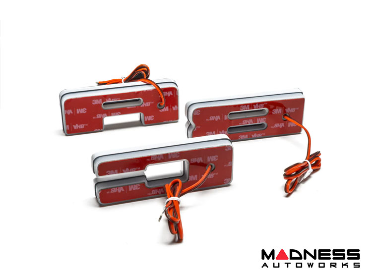 The LED lighting has a low draw, less than 0.1 Amp per letter. The overall size is approximately 3.75" wide x 1.4" tall and 0.5" thick. Installation is easy with the VHB double-stick adhesive. Wire the letters to a 12V source such as parking lights, ignition fuse, or a separate toggle switch.