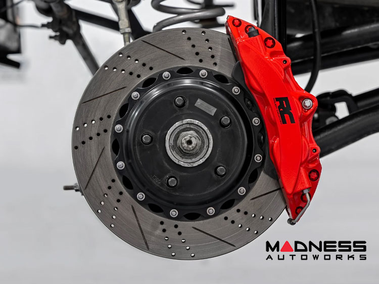 This brake kit features high-performance 6-piston calipers that offer exceptional braking force, ensuring quick, smooth, and precise stops. The calipers are not only built for functionality but also feature a durable red powder coating that resists corrosion and adds a striking aesthetic to your Jeep. With stainless steel pistons and high-temp piston seals, these calipers promise consistent hydraulic performance even under intense heat, making them ideal for both everyday driving and demanding off-road excursions.