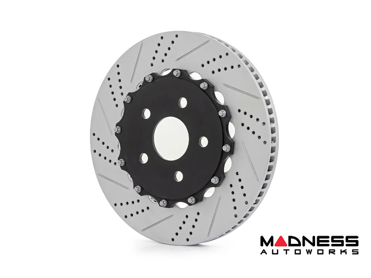 - Oversized drilled and slotted rotors for improved heat dissipation