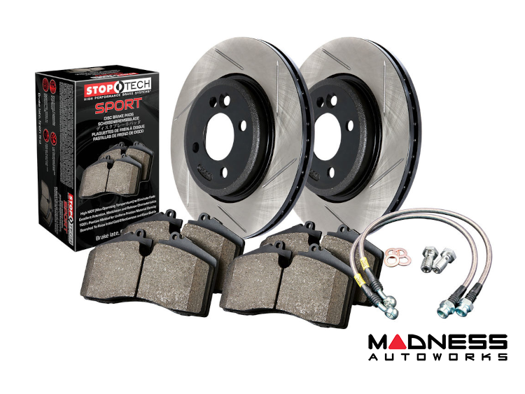 The included StopTech Sport Pads are specifically engineered to work seamlessly with the rotors, offering exceptional friction stability across a wide temperature range. This combination results in impressive braking power that is both predictable and consistent. Moreover, the stainless steel hoses are a crucial part of the package, ensuring a firmer pedal feel and better response, so every press counts when you need it most.