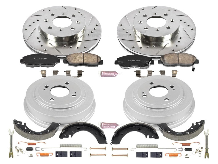 Honda Civic Brake Kit - Front + Rear - PowerStop - Slotted Rotors + PowerStop Z17 Brake Pads + PowerStop Evolution Premium Coated Drums - `12-`15