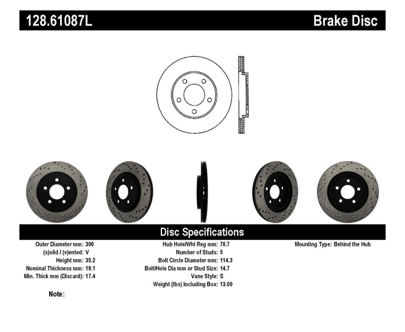 Delve into the unparalleled features of the StopTech Cross Drilled Brake Rotor, which combines high-performance technology with dependable durability. The unique cross-drilled design facilitates efficient heat dissipation and brake dust dispersion, providing improved braking performance whether conditions are wet or dry. Additionally, the black e-coating provides excellent protection against corrosion, while the high carbon metallurgy contributes to quieter operations, exceptional crack resistance, and overall enhanced braking performance. The integration of advanced metallurgy offers reduced pad squeal, pairing effectively with higher friction, European-style brake pad compounds.