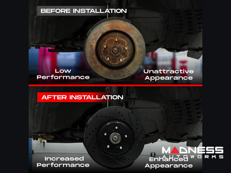 - Drilled and Slotted Rotors for efficient heat dissipation and braking performance.