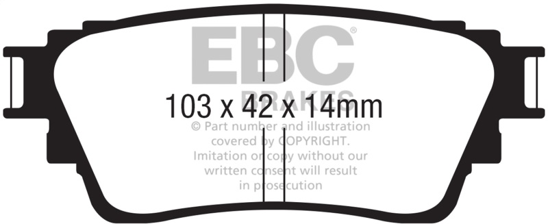 EBC Ultimax Slotted Rotors offer you the performance of slotted rotors but without the air noise that is normally associated with slotted rotors. The progressively angled slots on the EBC Ultimax Slotted Brake Rotors offer quiet brake operation without that excessive air noise, while still allowing the slots to help keep your brakes cool. The angled slots pull in cool air for cooler brake operation which helps your brakes perform at their best. The slots also help to clear any excess dust and debris to help keep pad grip to a maximum while also increasing pad longevity.. 6000 Series Greenstuff Truck/SUV Brakes Disc Pads; FMSI Pad No. D2135; Solid; 302mm Dia.; Pad Dimensions: 103 x 42 x 14mm;. EBC 18-21 Mitsubishi Outlander Greenstuff Rear Brake Pads. 6000 Series Greenstuff Truck/SUV Brakes Disc Pads. Sport Replacement Pad For Truck/SUV. Improves Stopping Power. Disc Brake Pad Set. Disc Brake Pad. Lower Dust