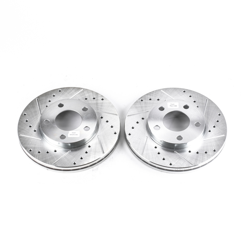 Power Stop drilled and slotted rotors provide a bolt-on upgrade for improved brake cooling and performance. Precision cross-drilled for maximum cooling and maximum performance during extreme conditions; rounded slots sweep away gasses, dust, and moisture to keep a clean friction contact patch on the rotor surface. Silver zinc dichromate plating resists rust and corrosion. With a direct OE fit, there are no special modifications needed.. Manufactured to strict tolerances for DTV and runout for smooth quiet performance. Power Stop 94-04 Ford Mustang Front Evolution Drilled & Slotted Rotors - Pair. PowerStop Evolution Performance Drilled, Slotted & Plated Brake Rotor Pair. Precision cross-drilled for maximum cooling and optimum performance. Chamfered drill holes and rounded slots to minimize stress cracking. Bolt-on upgrade for stock brakes, no modifications necessary. Slotted friction surface sweeps away gasses, dust, and water. EVOLUTION DRILLED & SLOTTED ZINC PLATED ROTORS (PAIR). Weight and vane count match original equipment design. Zinc plated for protection against corrosion. 100% dynamic mill balanced. Disc Brake Rotor Set. Sold as a pair. PowerStop XPR