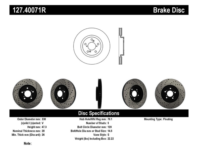 StopTech Drilled and Slotted Sport Rotors are 1-piece direct replacement brake discs for factory brake systems and stock calipers that look great behind your wheels – and offer significantly improved braking performance. The unique cross-drilling and slotting aids with heat and brake dust dispersal; prevents glazing of the pads; adds bite and improves wet and dry braking performance. Built to last; the black e-coating provides protection from corrosion and the high carbon metallurgy (in most applications) offers quieter operation; better crack resistance and increased performance.. StopTech Drilled and Slotted Sport Rotors are 1-piece direct replacement brake discs for factory brake systems and stock calipers that look great behind your wheels - and offer significantly improved braking performance. The unique cross-drilling and slotting aids with heat and brake dust dispersal; prevents glazing of the pads; adds bite and improves wet and dry braking performance. Built to last; the painted hat provides protection from corrosion and the high carbon metallurgy (in most applications) offers quieter operation; better crack resistance and increased performance.. Premium e-coated rotor with advanced metallurgy that greatly reduces pad squeal. Especially effective with higher friction; European style brake pad compounds. Drilled & Slotted for increased bite; improved looks and better performance. Premium e-coated rotor with advanced metallurgy that greatly reduces pad squeal. Especially effective with higher friction; European style brake pad compounds. Drilled/Slotted for increased bite; improved looks and better performance. Premium rotor with advanced metallurgy that greatly reduces pad squeal. Especially effective with higher friction; European style brake pad compounds. Drilled & Slotted for increased bite; improved looks and better performance. Premium e-coated rotor with advanced metallurgy that greatly reduces pad squeal; Especially effective with higher friction; European style brake pad compounds; Added Molybdenum and Chromium to resist rotor cracking. Sport Drilled Rotor; StopTech; StopTech Rotor; Stop Tech Rotor; Stop-Tech Sport Rotor; StopTech Sport Rotor; StopTech Brake Rotor; Stoptech Drilled/Slotted Rotor. 2007 - 2013 Acura MDX, 2014 - 2020 Acura RLX, 2010 - 2013 Acura ZDX, 2009 - 2015 Honda Pilot. StopTech 07-08 Acura MDX SportStop Slotted & Drilled Right Front Rotor. StopTech Sport Drilled & Slotted Brake Rotor; Front Right. StopTech Sport Drilled/Slotted Brake Rotor; Front Right. Black E-Coated Non-Friction - Corrosion Protection. Double Disk Ground For Consistent Friction Surface. Superior Resistance To Cracks From Thermal Stress. Sport Drilled & Slotted Brake Rotor; Front Right. Drilled/Slotted Helps Evacuate Gasses/Dust/Heat. Directional Curve Vane Designs On Selected Apps. Power Alloy Is Descendant Of Patented AeroRotor. Increased Initial bite and Wet Weather Response. Sport Drilled/Slotted Brake Rotor; Front Right. StopTech Sport Drilled/Slotted Disc. Sport Drilled/Slotted Brake Rotor. Stoptech Drilled/Slotted Rotor. Direct OE Replacement. Slot/Drill Rotor. Disc Brake Rotor
