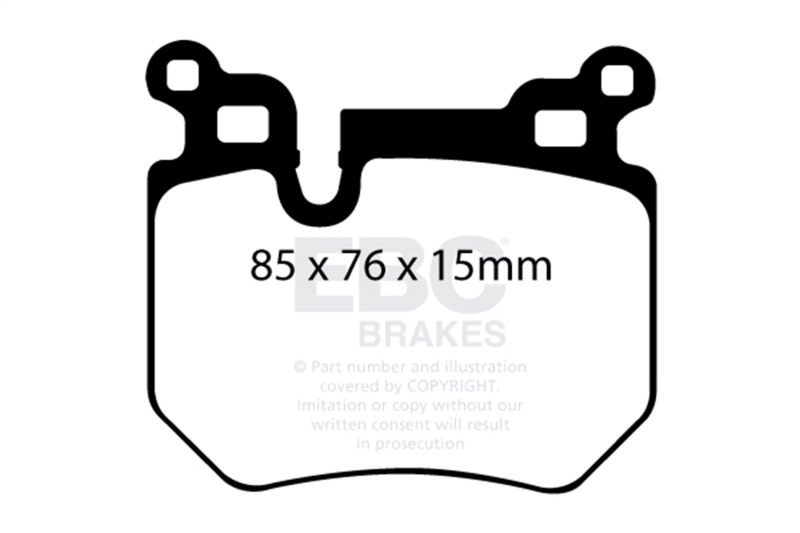 EBC Yellowstuff is an aramid fibre based brake compound with high brake effect form cold and is possibly one of the first ever compounds that can be used for STREET AND TRACK DRIVING. These pads do not require warm up but do get even stronger under the heat of hard driving. These are not a low dust pad and if your desire is for a low dust premium street use pad, you should consider EBC Redstuff.When considering full race use, Yellowstuff has been a strong favourite, having been used for two years in the Swedish Camaro Cup and at numerous other race events where a stock caliper system is fitted.It is also the choice of 90-percent of the Mazda MX5 Miata competitors in the UK race series and has an unblemished record as rotor friendly track pad for vehicles up to 2000 lbs weight or 200 BHP.In the USA the SCCA and NASA drivershave been testing Yellowstuff with feedback and good reports POURING in from a 543 test driver major market proving event with these groups. Read that figure again 543 test drivers.There is no guesswork here.. Yellowstuff Street And Track Brake Pads; FMSI Pad No. D1372; Vented; 324mm Dia.; 77mm Height; 22mm Thick; 75mm Center Hole Dia.; Pad Dimensions: 85 x 76 x 15mm;. EBC 08-10 BMW 135 3.0 Twin Turbo Yellowstuff Rear Brake Pads. Yellowstuff Street And Track Brake Pads. Zero Fade Race Developed Compound. Brakes Effective Right From Cold. Can Be Used On Street/Race Track. Better High Speed Stopping. Disc Brake Pad Set. High Friction Pad. Disc Brake Pad