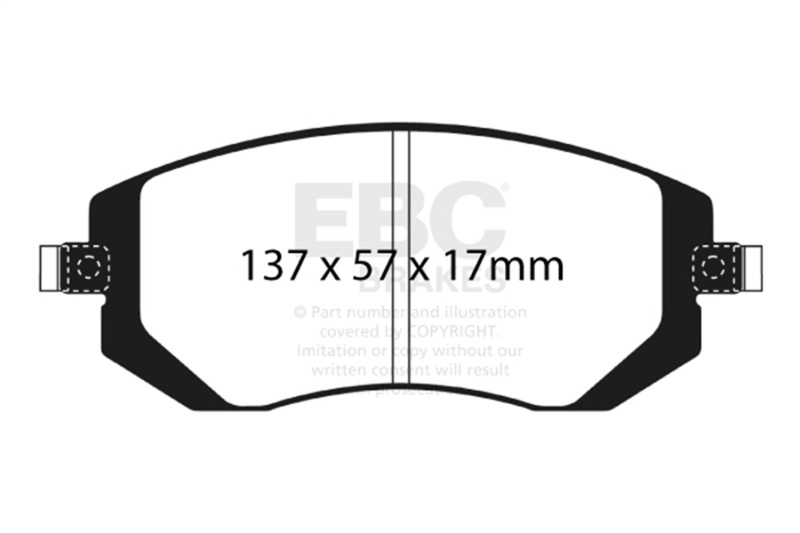 Designed for premium street driving offering better brake effect up to 600-degrees C (1100-degrees F). EBC Greenstuff has a high initial brake effect and gives drivers confidence from first application of the brake pedal. There is no such thing as a NO DUST pad. The very nature of how a brake works requires that some dust be generated to avoid rotor vibration (shimmying). The EBC pad creates less dust and dust is more easily washed off than most. All pads create more dust as they are bedding in especially if rotors are worn. Nominal friction coefficient 0.55. For heavier faster cars and vehicles above 200bhp we strongly recommend Redstuff which DOES offer much less dust.. Greenstuff 2000 Series Sport Brake Pads; FMSI Pad No. D929; Vented; 277mm Dia.; 57mm Height; 24mm Thick; 58mm Center Hole Dia.; Pad Dimensions: 137 x 57 x 17mm;. EBC 04-06 Saab 9-2X 2.0 Turbo Greenstuff Front Brake Pads. Greenstuff 2000 Series Sport Brake Pads. Ideal For Lighter Sport Compacts. Number One Selling Sport Pad. Improves Stopping Power. Disc Brake Pad Set. Reduces Heat Fade. Minimal Dusting. Disc Brake Pad