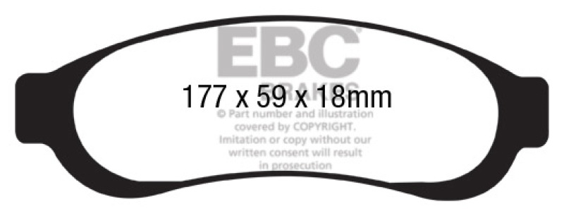 If you simply need a quality OEM replacement pad, look no further than Ultimax. Made in the UK Bristol EBC Brakes manufacturing plant Ultimax is a beautifully engineered brake compound that lasts well, produces minimal dust and is the perfect choice for the urban or daily driver. Why spend more if all you need is a quality replacement pad.The Ultimax pad does include a small percentage of steel fibre to achieve its price point, far less content than our competition where steel fibre content can attain 50 volume and this optimum fibre blend is what makes Ultimax both popular and unique amongst brake blends .Once bedded in Ultimax will inspire confidence in any car light truck or SUV no matter how you drive.Its universal heat range abilities and low rotor wear are additional benefits of the Ultimax pad range which is the EBC worldwide number one selling brake with numbers of sets sold running into tens of millions over the recent years. Unlike many of our performance grades Ultimax has remain unchanged as a pad compound for ten years now, a true testament to its success and customer acceptance. Why change a winning formula.Black coded in the EBC range EBC Ultimax is a fully ECE R 90 approved brake pad range and at its lower price point, less than HALF the price of original parts yet TOTALLY EQUIVALENT by nature of its R 90 brake safety approval, Ultimax offers great value for money and first class driving safety.When replacing brakes of any kind please remember how important brake safety is to your own well being and either have a professional mechanic install your new brakes or if you are a qualified mechanic use the EBC installation DVD as a guide in support of your vehicle owner's manual. These installation guide DVD tasters can be viewed here and the full DVD purchased from online vendors.. If you simply need a quality OEM replacement pad, look no further than Ultimax. Made in the UK Bristol EBC Brakes manufacturing plant Ultimax is a beautifully engineered brake compound that lasts well, produces minimal dust and is the perfect choice for the urban or daily driver. Why spend more if all you need is a quality replacement pad.The Ultimax pad does include a small percentage of steel fibre to achieve its price point, far less content than our competition where steel fibre content can attain 50 volume and this optimum fibre blend is what makes Ultimax both popular and unique amongst brake blends .Once bedded in Ultimax will inspire confidence in any car light truck or SUV no matter how you drive.Its universal heat range abilities and low rotor wear are additional benefits of the Ultimax pad range which is the EBC worldwide number one selling brake with numbers of sets sold running into tens of millions over the recent years. Unlike many of our performance grades Ultimax has remain unchanged as a pad compound for ten years now, a true testament to its success and customer acceptance. Why change a winning formula.Black coded in the EBC range EBC Ultimax is a fully ECE R 90 approved brake pad range and at its lower price point, less than HALF the price of original parts yet TOTALLY EQUIVALENT by nature of its R 90 brake safety approval, Ultimax offers great value for money and first class driving safety.When replacing brakes of any kind please remember how important brake safety is to your own well being and either have a professional mechanic install your new brakes or if you are a qualified mechanic use the EBC installation DVD as a guide in support of your vehicle owner's manual. These installation guide DVD tasters can be viewed here and the full DVD purchased from online vendors.. Ultimax OEM Replacement Brake Pads; FMSI Pad No. D1067; Pad Dimensions: 177 x 59 x 18mm;. EBC 05-07 Ford F350 (inc Super Duty) 5.4 DRW 2WD Ultimax2 Rear Brake Pads. High Friction European Spec Friction. Ultimax OEM Replacement Brake Pads. Shimmed Slotted And Chamfered. Premium OE Replacement Pad. Ideal For Daily Driver Use. Disc Brake Pad Set. Disc Brake Pad. OE Hardware