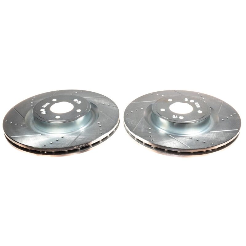 Power Stop drilled and slotted rotors provide a bolt-on upgrade for improved brake cooling and performance. Precision cross-drilled for maximum cooling and maximum performance during extreme conditions; rounded slots sweep away gasses, dust, and moisture to keep a clean friction contact patch on the rotor surface. Silver zinc dichromate plating resists rust and corrosion. With a direct OE fit, there are no special modifications needed.. Manufactured to strict tolerances for DTV and runout for smooth quiet performance. Power Stop 19-21 Genesis G70 Front Evolution Drilled & Slotted Rotors - Pair. PowerStop Evolution Performance Drilled, Slotted & Plated Brake Rotor Pair. Precision cross-drilled for maximum cooling and optimum performance. Chamfered drill holes and rounded slots to minimize stress cracking. Bolt-on upgrade for stock brakes, no modifications necessary. Slotted friction surface sweeps away gasses, dust, and water. EVOLUTION DRILLED & SLOTTED ZINC PLATED ROTORS (PAIR). Weight and vane count match original equipment design. Zinc plated for protection against corrosion. 100% dynamic mill balanced. Disc Brake Rotor Set. Sold as a pair. PowerStop XPR