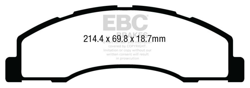 The UK EFI Bristol factory of EBC Brakes has used new ECO friendly technology to develop a brake pad that has unusually high friction levels yet still has good manners for street use with brake effect being strong from cold when the brake is first applied. The race pedigree of the material used also guarantees effective stopping up to temperatures exceeding 1400 F well above the maximum experienced in heavy braking, towing or downhill descents. Winter testing in Ohio on a fleet five popular light trucks showed us the proof on cold braking in the worst wet and cold conditions where many performance brakes would not even start to show good brake effect. So these are pads that have an extremely wide range of usability. The new carbon granule based Extra Duty material is also rotor friendly, minimal in dust and noiseless and each set is supplied with revolutionary NUCAP piston insert shims, another first from EBC. Truck/SUV Extra Duty Brake Pads; FMSI Pad No. D1328; Vented; 337/344mm Dia.; 196.7mm Height; 40/41mm Thick; 63.1/101.2mm Center Hole Dia.; Pad Dimensions: 214.4 x 69.8 x 18.7mm;. EBC 08-14 Ford Econoline E150 4.6L Extra Duty Front Brake Pads. Truck/SUV Extra Duty Brake Pads. Extended Duty Brake Pads. Disc Brake Pad Set. Disc Brake Pad