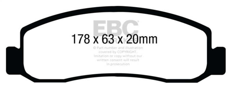 The UK EFI Bristol factory of EBC Brakes has used new ECO friendly technology to develop a brake pad that has unusually high friction levels yet still has good manners for street use with brake effect being strong from cold when the brake is first applied. The race pedigree of the material used also guarantees effective stopping up to temperatures exceeding 1400 F well above the maximum experienced in heavy braking, towing or downhill descents. Winter testing in Ohio on a fleet five popular light trucks showed us the proof on cold braking in the worst wet and cold conditions where many performance brakes would not even start to show good brake effect. So these are pads that have an extremely wide range of usability. The new carbon granule based Extra Duty material is also rotor friendly, minimal in dust and noiseless and each set is supplied with revolutionary NUCAP piston insert shims, another first from EBC. Truck/SUV Extra Duty Brake Pads; FMSI Pad No. D1333; Vented; 347mm Dia.; 115mm Height; 38mm Thick; 125mm Center Hole Dia.; Pad Dimensions: 178 x 63 x 20mm;. EBC 08-10 Ford F250 (inc Super Duty) 5.4 (2WD) Extra Duty Front Brake Pads. Truck/SUV Extra Duty Brake Pads. Extended Duty Brake Pads. Disc Brake Pad Set. Disc Brake Pad