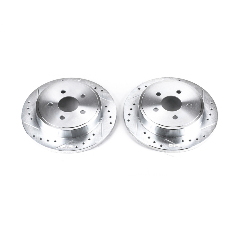 Power Stop drilled and slotted rotors provide a bolt-on upgrade for improved brake cooling and performance. Precision cross-drilled for maximum cooling and maximum performance during extreme conditions; rounded slots sweep away gasses, dust, and moisture to keep a clean friction contact patch on the rotor surface. Silver zinc dichromate plating resists rust and corrosion. With a direct OE fit, there are no special modifications needed.. Power Stop 03-07 Chrysler PT Cruiser Rear Evolution Drilled & Slotted Rotors - Pair. Manufactured to strict tolerances for DTV and runout for smooth quiet performance. PowerStop Evolution Performance Drilled, Slotted & Plated Brake Rotor Pair. Precision cross-drilled for maximum cooling and optimum performance. Chamfered drill holes and rounded slots to minimize stress cracking. Bolt-on upgrade for stock brakes, no modifications necessary. Slotted friction surface sweeps away gasses, dust, and water. EVOLUTION DRILLED & SLOTTED ZINC PLATED ROTORS (PAIR). Weight and vane count match original equipment design. Zinc plated for protection against corrosion. 100% dynamic mill balanced. Disc Brake Rotor Set. Sold as a pair. PowerStop XPR