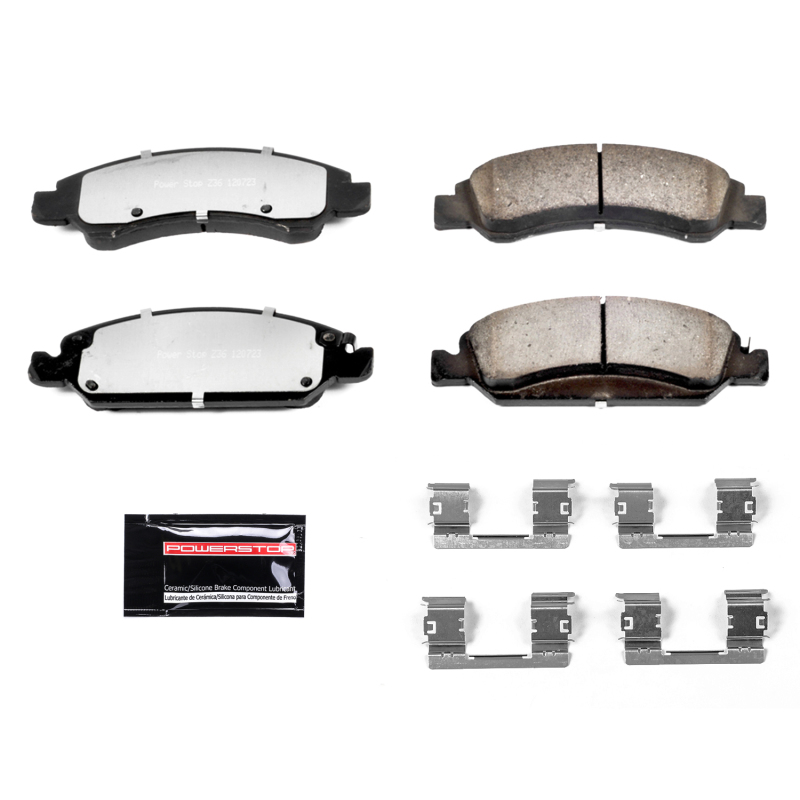 The PowerStop Z36 Truck & Tow ceramic brake pads are designed as an upgrade over stock brakes to reduce brake dust & eliminate noise for those that tow and haul, as well as the off-road enthusiast. These brake pads are made with a low-dust ceramic formula, infused with carbon-fiber to strengthen the compound and provide severe-duty stopping power for trucks and SUVs. Premium stainless-steel hardware along with ceramic brake lubricant is included with the Z36 brake pads making it easier to complete your brake job. Use Z36 Truck & Tow brake pads to give your truck or SUV the severe-duty stopping power it deserves.. Carbon-fiber ceramic formulation to provide severe-duty stopping power for Trucks, SUVs, and 4x4's. Multi-layer stainless-steel shims for increased heat dissipation & virtually noise-free braking. Includes Premium stainless-steel hardware and ceramic brake lubricant for easy installation. Power Stop 06-18 Chevrolet Silverado 1500 Front Z36 Truck & Tow Brake Pads w/Hardware. Powder coated backing plate resists rust and corrosion to provide extended pad life. PowerStop - Z36 Truck and SUV Carbon-Fiber Ceramic Brake Pads with Hardware Kit. Low dust formulation verified in 3rd party on-vehicle testing. Positive mold technology for consistent wear and performance. Z36 TRUCK & TOW CARBON-FIBER CERAMIC BRAKE PADS W/ HARDWARE. Chamfered and slotted to ensure noise free braking. Thermal scorched pad surface for a fast break-in. Disc Brake Pad Set. Z36 Brake Pads