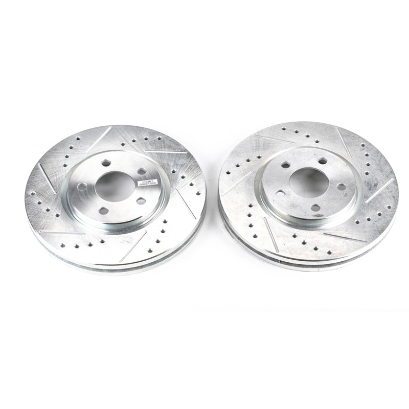 Power Stop drilled and slotted rotors provide a bolt-on upgrade for improved brake cooling and performance. Precision cross-drilled for maximum cooling and maximum performance during extreme conditions; rounded slots sweep away gasses, dust, and moisture to keep a clean friction contact patch on the rotor surface. Silver zinc dichromate plating resists rust and corrosion. With a direct OE fit, there are no special modifications needed.. Power Stop 03-09 Chrysler PT Cruiser Front Evolution Drilled & Slotted Rotors - Pair. Manufactured to strict tolerances for DTV and runout for smooth quiet performance. PowerStop Evolution Performance Drilled, Slotted & Plated Brake Rotor Pair. Precision cross-drilled for maximum cooling and optimum performance. Chamfered drill holes and rounded slots to minimize stress cracking. Bolt-on upgrade for stock brakes, no modifications necessary. Slotted friction surface sweeps away gasses, dust, and water. EVOLUTION DRILLED & SLOTTED ZINC PLATED ROTORS (PAIR). Weight and vane count match original equipment design. Zinc plated for protection against corrosion. 100% dynamic mill balanced. Disc Brake Rotor Set. Sold as a pair. PowerStop XPR