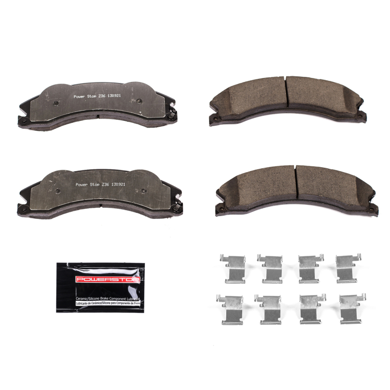 The PowerStop Z36 Truck & Tow ceramic brake pads are designed as an upgrade over stock brakes to reduce brake dust & eliminate noise for those that tow and haul, as well as the off-road enthusiast. These brake pads are made with a low-dust ceramic formula, infused with carbon-fiber to strengthen the compound and provide severe-duty stopping power for trucks and SUVs. Premium stainless-steel hardware along with ceramic brake lubricant is included with the Z36 brake pads making it easier to complete your brake job. Use Z36 Truck & Tow brake pads to give your truck or SUV the severe-duty stopping power it deserves.. Carbon-fiber ceramic formulation to provide severe-duty stopping power for Trucks, SUVs, and 4x4's. Power Stop 2011 Chevrolet Silverado 2500 HD Front or Rear Z36 Truck & Tow Brake Pads w/Hardware. Multi-layer stainless-steel shims for increased heat dissipation & virtually noise-free braking. Includes Premium stainless-steel hardware and ceramic brake lubricant for easy installation. Powder coated backing plate resists rust and corrosion to provide extended pad life. PowerStop - Z36 Truck and SUV Carbon-Fiber Ceramic Brake Pads with Hardware Kit. Low dust formulation verified in 3rd party on-vehicle testing. Positive mold technology for consistent wear and performance. Z36 TRUCK & TOW CARBON-FIBER CERAMIC BRAKE PADS W/ HARDWARE. Chamfered and slotted to ensure noise free braking. Thermal scorched pad surface for a fast break-in. Disc Brake Pad Set. Z36 Brake Pads