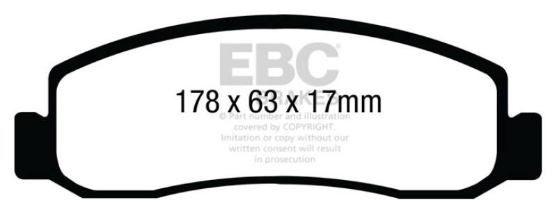 EBC Yellowstuff is an aramid fibre based brake compound with high brake effect form cold and is possibly one of the first ever compounds that can be used for STREET AND TRACK DRIVING. These pads do not require warm up but do get even stronger under the heat of hard driving. These are not a low dust pad and if your desire is for a low dust premium street use pad, you should consider EBC Redstuff.When considering full race use, Yellowstuff has been a strong favourite, having been used for two years in the Swedish Camaro Cup and at numerous other race events where a stock caliper system is fitted.It is also the choice of 90-percent of the Mazda MX5 Miata competitors in the UK race series and has an unblemished record as rotor friendly track pad for vehicles up to 2000 lbs weight or 200 BHP.In the USA the SCCA and NASA drivershave been testing Yellowstuff with feedback and good reports POURING in from a 543 test driver major market proving event with these groups. Read that figure again 543 test drivers.There is no guesswork here.. Yellowstuff Street And Track Brake Pads; FMSI Pad No. D1333; Vented; 347mm Dia.; 115mm Height; 38mm Thick; 125mm Center Hole Dia.; Pad Dimensions: 178 x 63 x 20mm;. EBC 11 Ford F250 (inc Super Duty) 6.2 (2WD) Yellowstuff Front Brake Pads. Yellowstuff Street And Track Brake Pads. Zero Fade Race Developed Compound. Brakes Effective Right From Cold. Can Be Used On Street/Race Track. Better High Speed Stopping. Disc Brake Pad Set. High Friction Pad. Disc Brake Pad