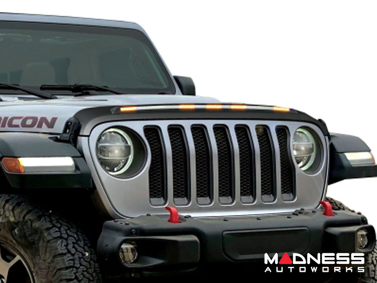 The light bar consists of 5 LED marker lights and is powered by connecting into your Jeep's parking lights for seamless integration. This Hood protector is constructed out of super-strong Dura-Flex 2000 TPO that comes with a textured black finish. This light-up bug shield is perfect for any person that does a lot of night driving.