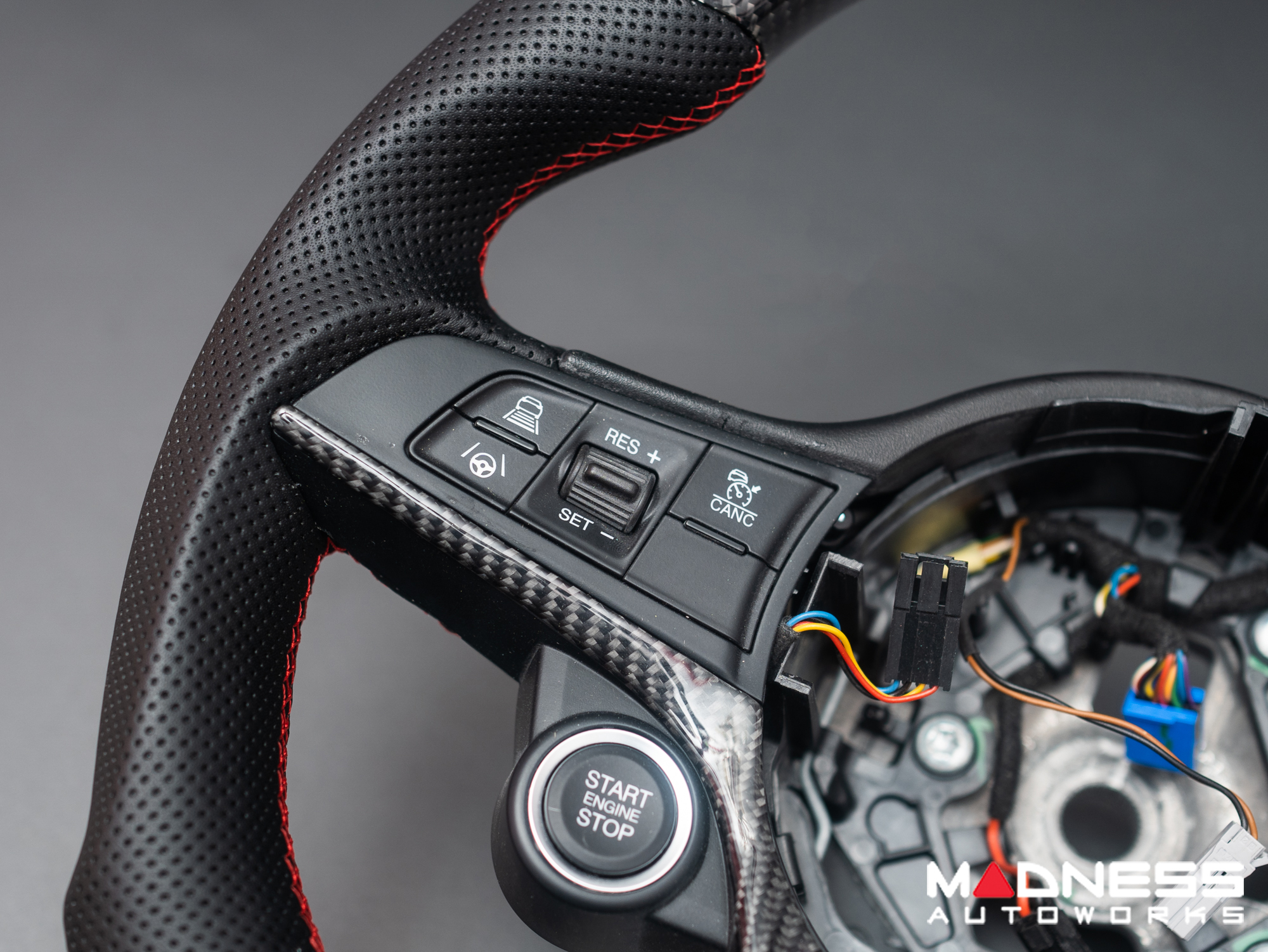 - Steering Wheel features Genuine Carbon Fiber Top and Bottom Parts