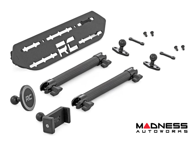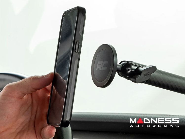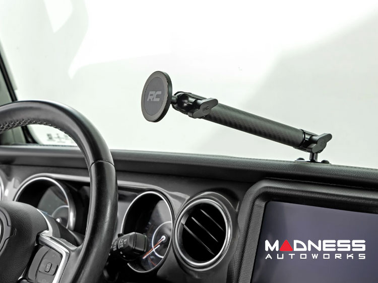 The Jeep Wrangler JL Dash Mount Phone Mount with 8in Extension Arm by Rough Country refines your driving experience by securely positioning your mobile device where you need it most.